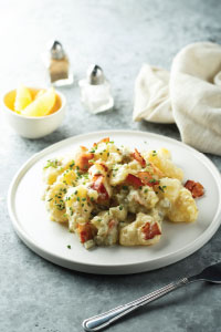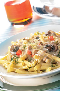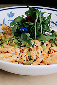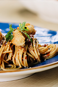 Spaghetti served with crispy breaded chicken and tossed in a creamy roasted sesame mayonnaise dressing.