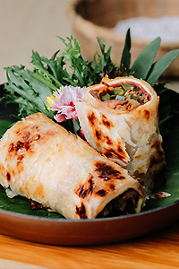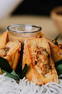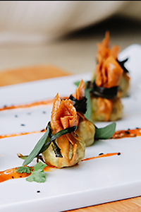 A bite-sized snack stuffed with shrimps in thin and crispy wonton skin.