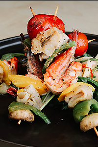 Grilled seafood with local herbs on skewers, served with Cannellini beans salad